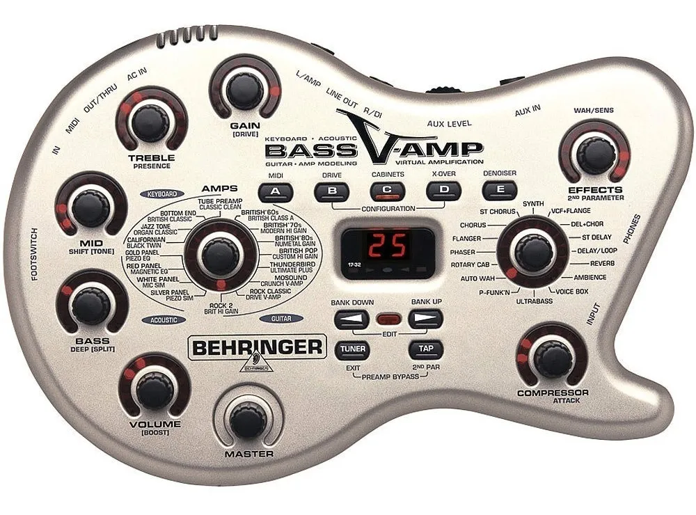 O Bass V-Amp é um pré-amplificador virtual para contrabaixo que estabelece novos padrões no mundo dos simuladores de amplificação. Desenvolvido com tecnologia Physical Modeling, reproduz com fidelidade o som autêntico de amplificadores clássicos, aliado aos mais modernos efeitos DSP.